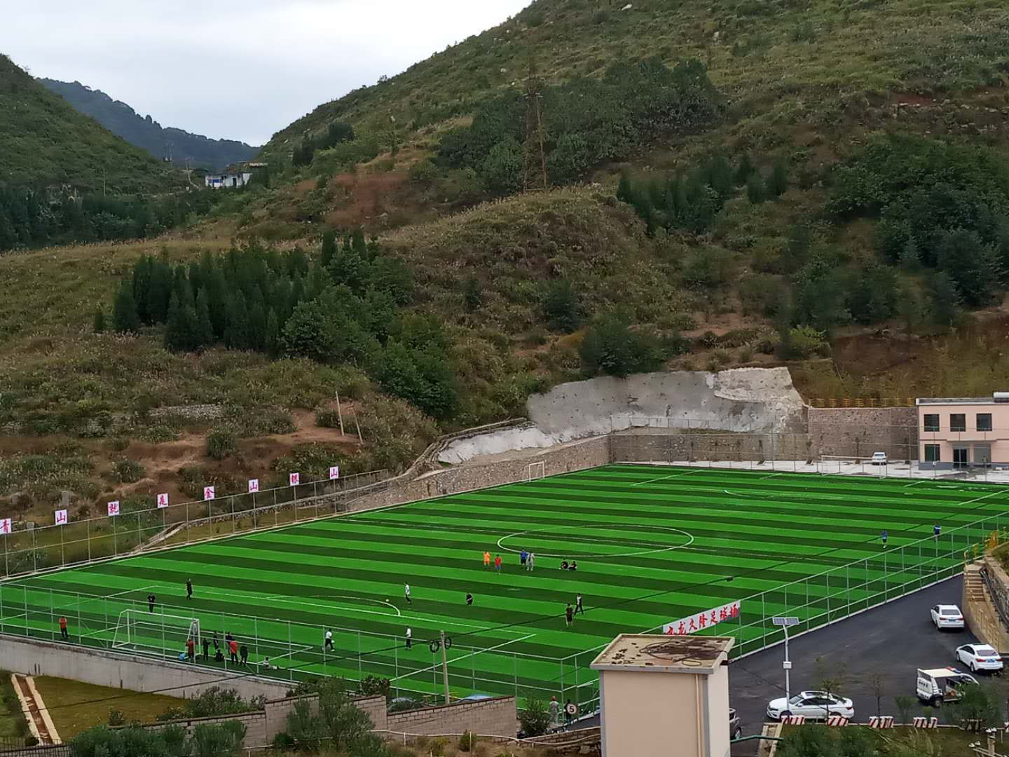 为积极响应全民健身号召,普及推广足球运动,根据县委县政府的总体规划和部署,企业在原堆存钙渣的渣库位置规划建设了用于11人制比赛的标准足球场,足球场建设项目于2020年4月21日开工,9月30日竣工,并于10月26日顺利通过工程验收。规划整齐、绿意盎然的足球场成了员工积足球运动爱好者业余时间锻炼身体的运动场,干净整洁的道路、漫山遍野的油茶花以及灌木点缀的渣库绿化也成了企业又一道亮丽的风景线。